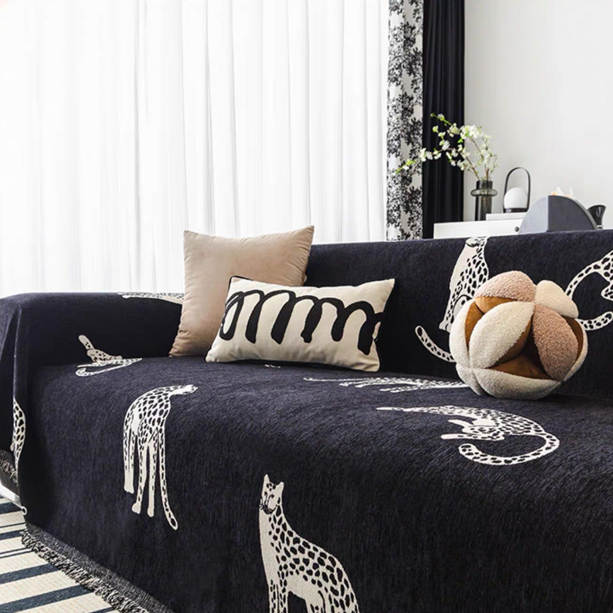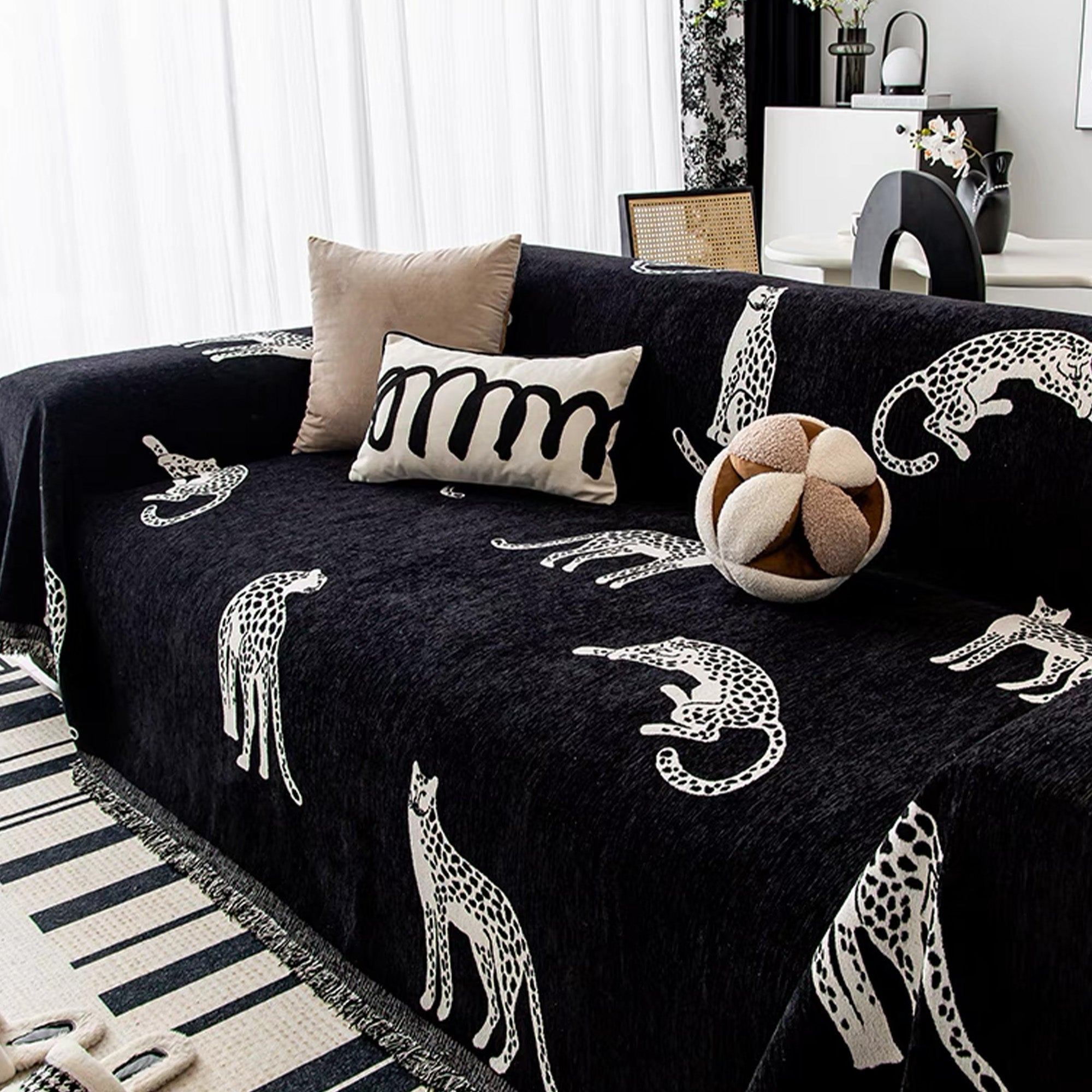 Voeg een gedurfde en exotische flair toe aan je woonkamer met de Wild Elegance bankhoes. Deze hoes heeft een opvallend dessin van luipaarden in verschillende poses op een strakke, donkere achtergrond, wat je bank een unieke en stijlvolle look geeft. Gemaakt van zachte, duurzame stof, is hij perfect voor een chique, avontuurlijke sfeer en beschermt hij tegelijkertijd je meubels.