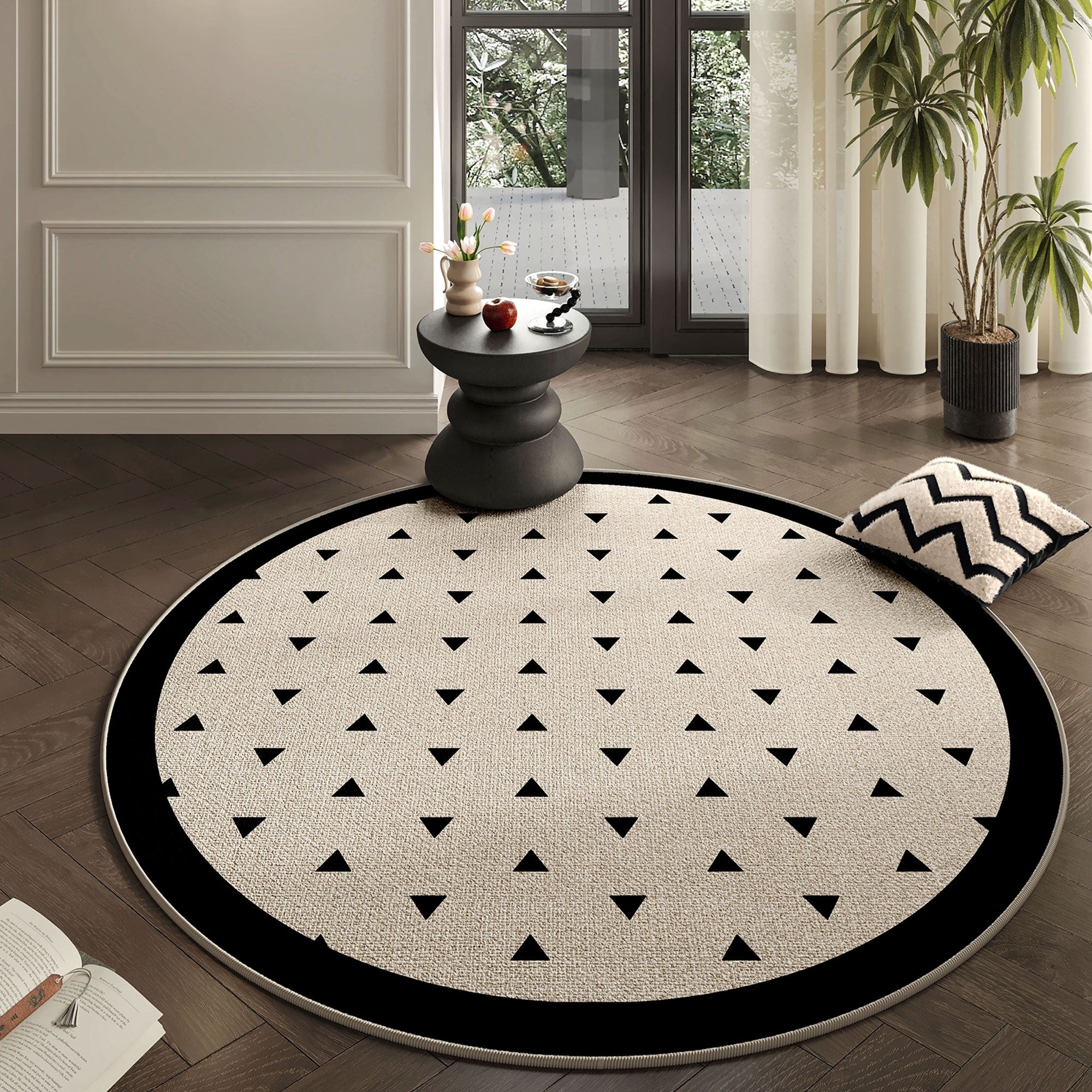 Geef je kamer een speelse, moderne touch met dit geometrische, driehoekige ronde vloerkleed! Met een minimalistisch patroon van kleine zwarte driehoekjes op een zachtbeige achtergrond, omzoomd door een opvallende zwarte ring, combineert dit vloerkleed eenvoud en stijl in een uniek ontwerp.