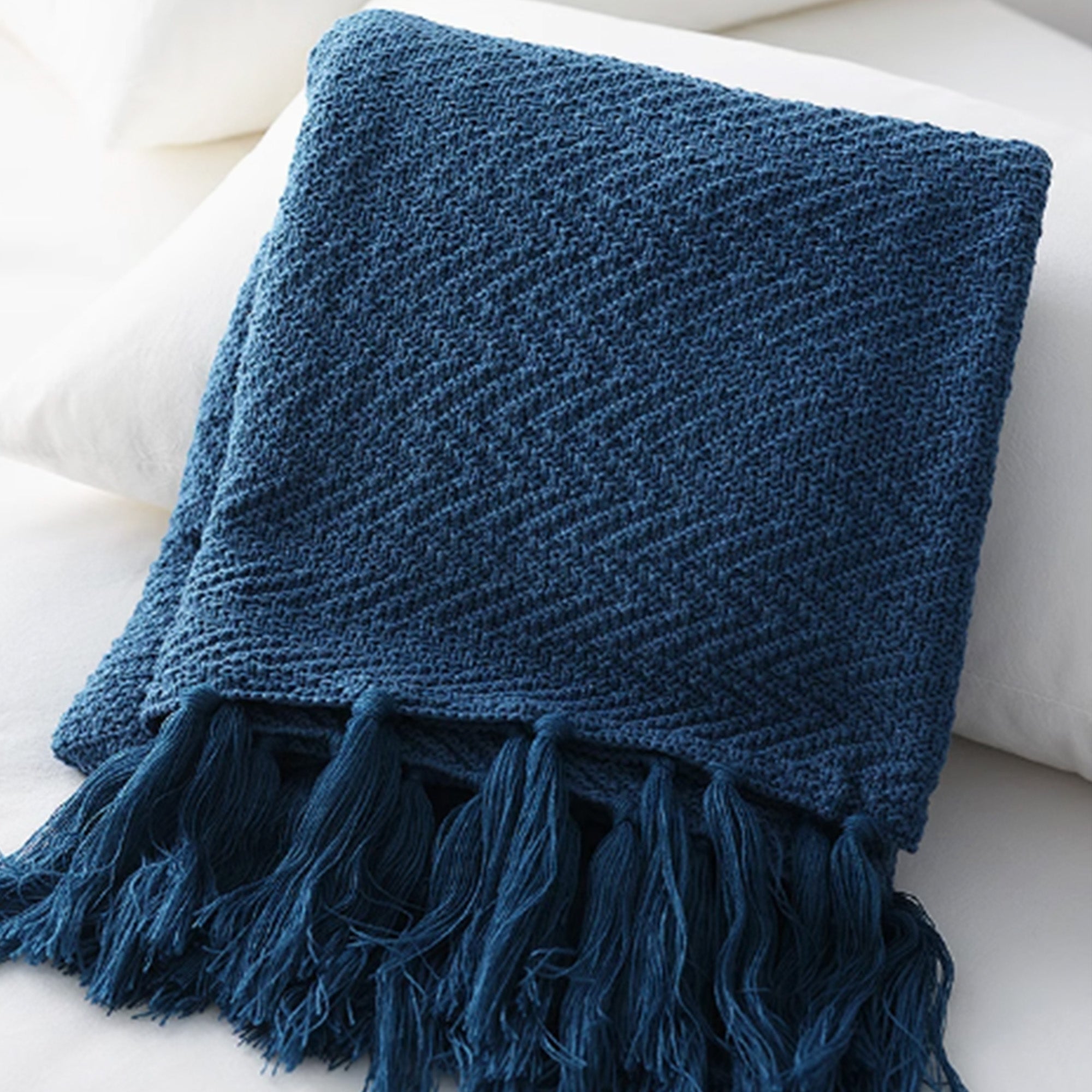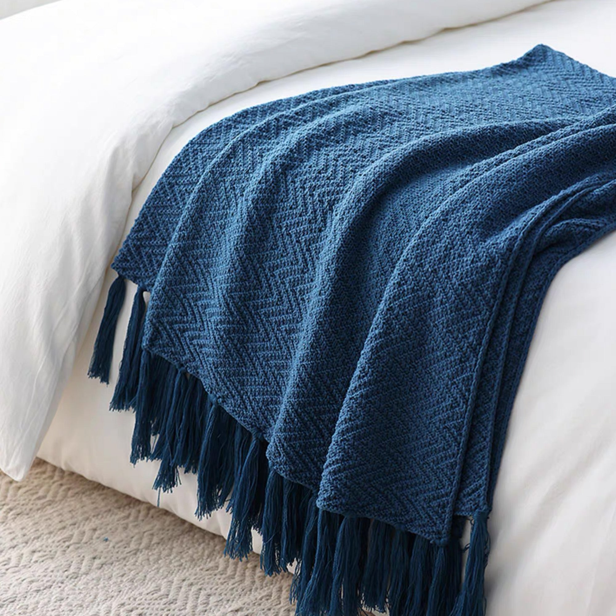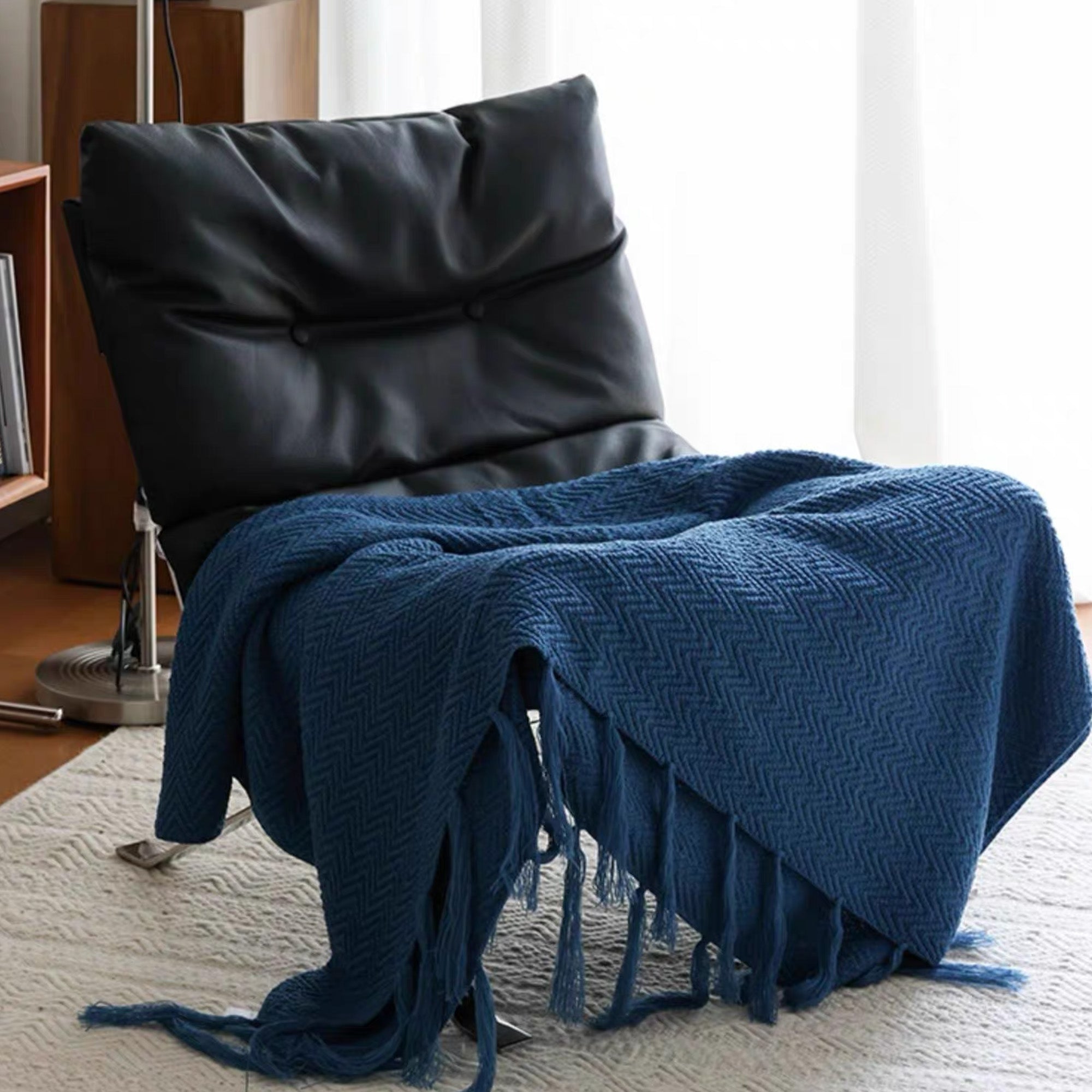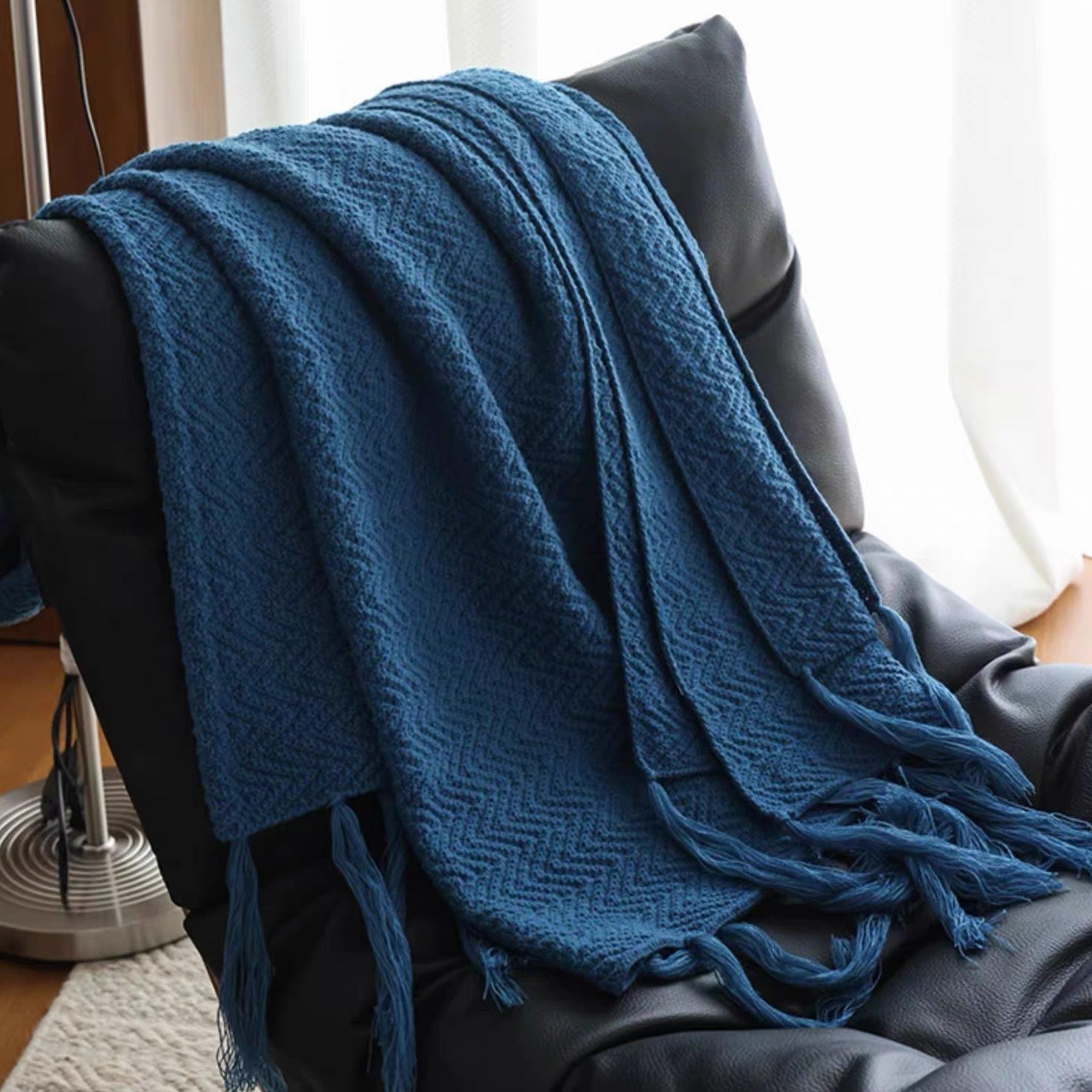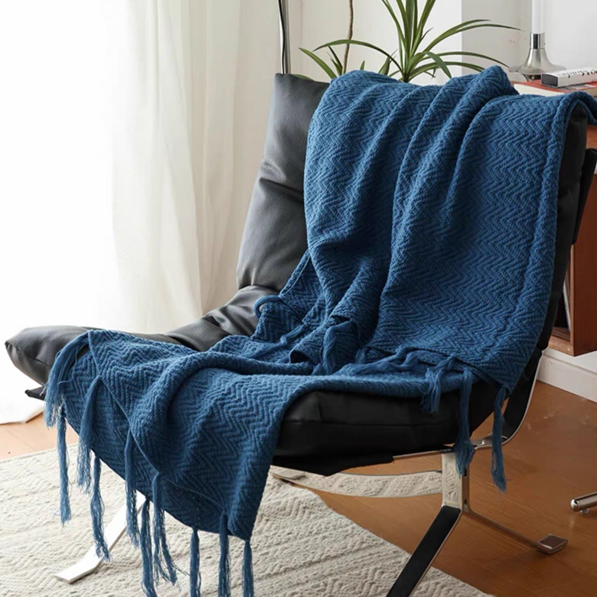 Omarm de warmte en elegantie van Scandinavisch design met onze Nordic gebreide plaid. Deze rijkelijk gestructureerde, diepblauwe deken heeft een klassiek visgraatmotief en is versierd met lange, vloeiende kwastjes, die elke kamer een gezellige en stijlvolle laag geven. Perfect om jezelf in te wikkelen op koude nachten of als een prachtig decoratief accent voor banken, bedden of leeshoekjes.