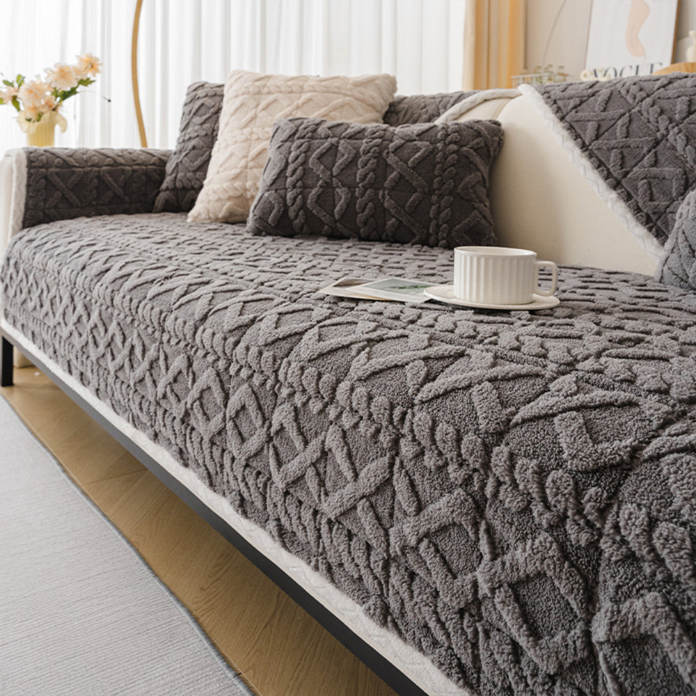 Breng een vleugje retro charme en gezellige warmte in huis met onze Retro Weave Plush antislip bankhoes. Deze hoes is ontworpen voor de herfst en winter en is gemaakt van een zware, kortpolige pluche stof die luxueuze zachtheid combineert met uitzonderlijke duurzaamheid. Het reliëf geometrische weefpatroon zorgt voor een rijke textuur en visuele diepte, waardoor het een perfecte mix is van vintage elegantie en modern comfort. Dankzij de antislip achterkant blijft de hoes stevig op zijn plaats, zowel voor dagelijkse ontspanning als voor gezinsactiviteiten. Of u nu uw bank beschermt tegen slijtage of uw interieur verfraait, deze hoes biedt zowel comfort als verfijning.