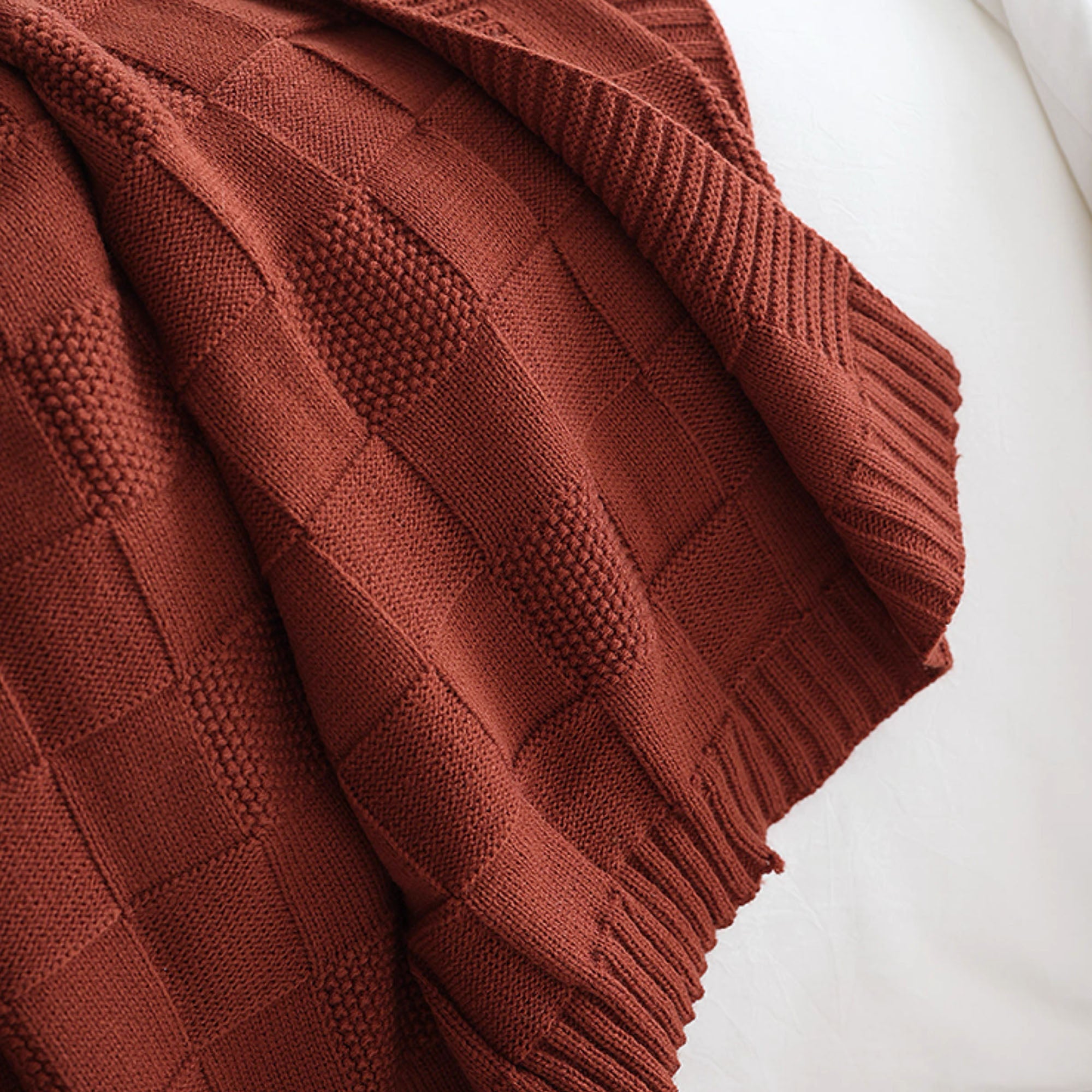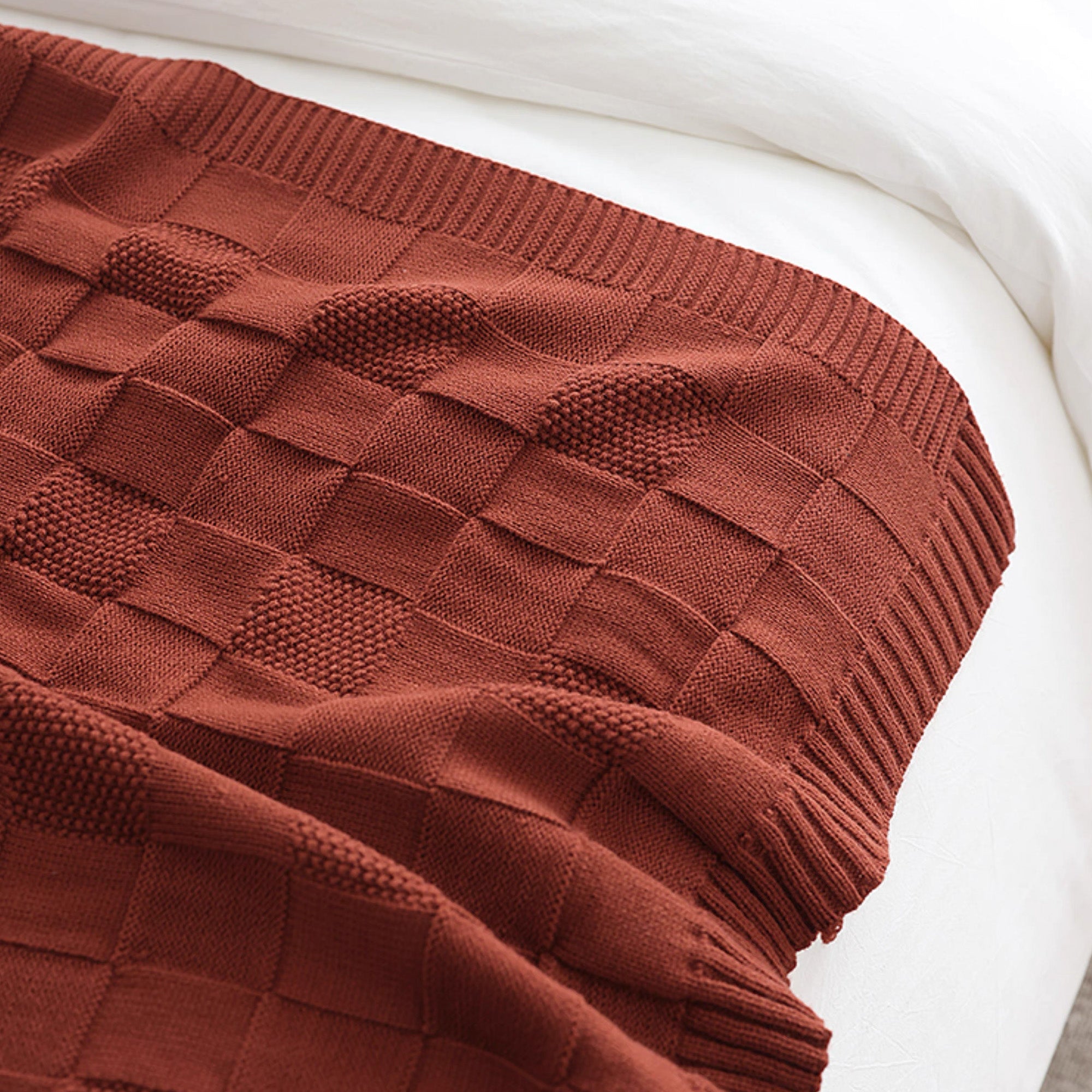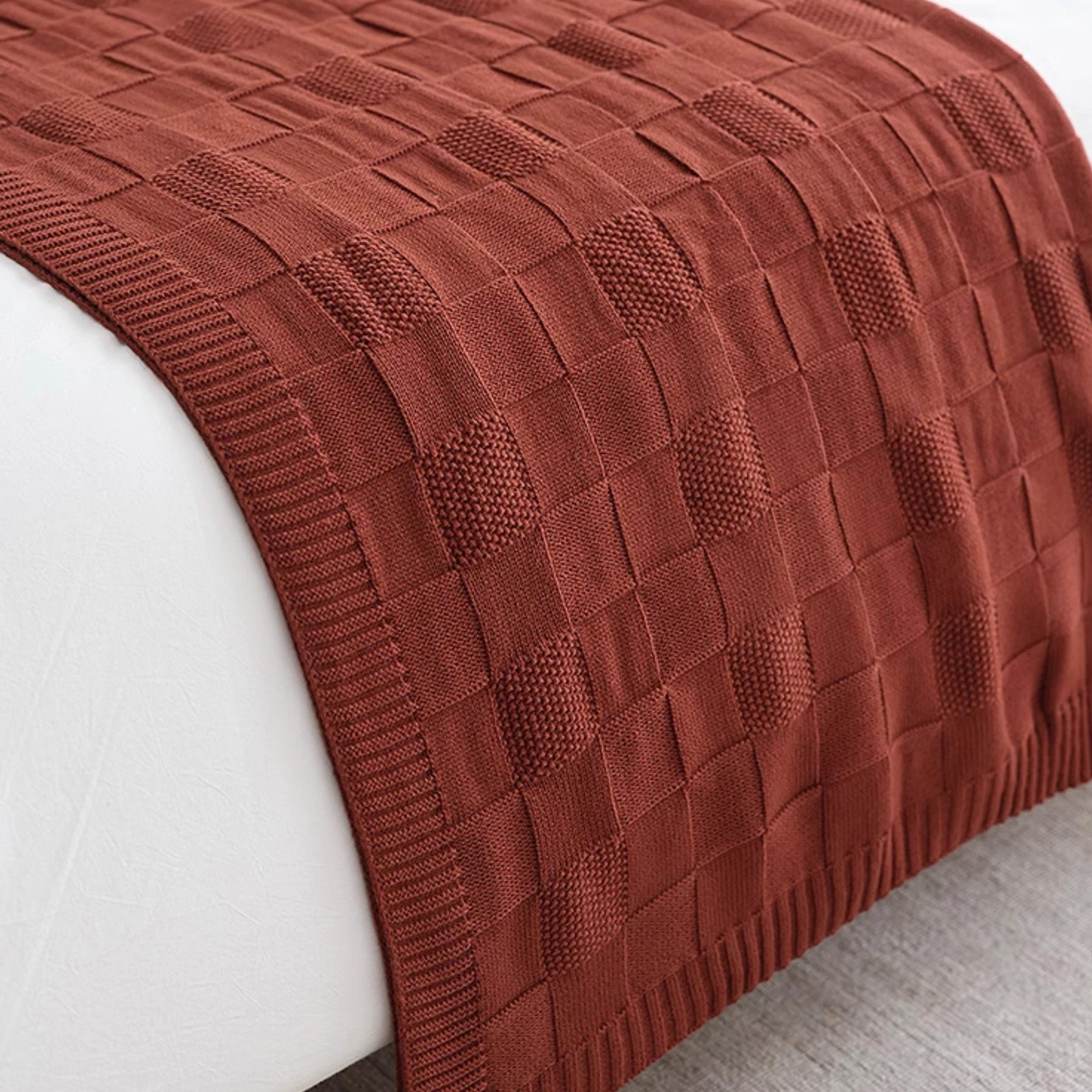 Voeg een vleugje warmte en stijl toe aan je huis met onze Textured Grid Knit Throw Blanket. Deze plaid, ontworpen met een opvallend rasterpatroon en gemaakt van comfortabel, hoogwaardig breiwerk, combineert comfort met een moderne look. De diepe, rijke kleur voegt verfijning toe aan elke kamer en is een perfect accent voor je bank, bed of leesstoel.