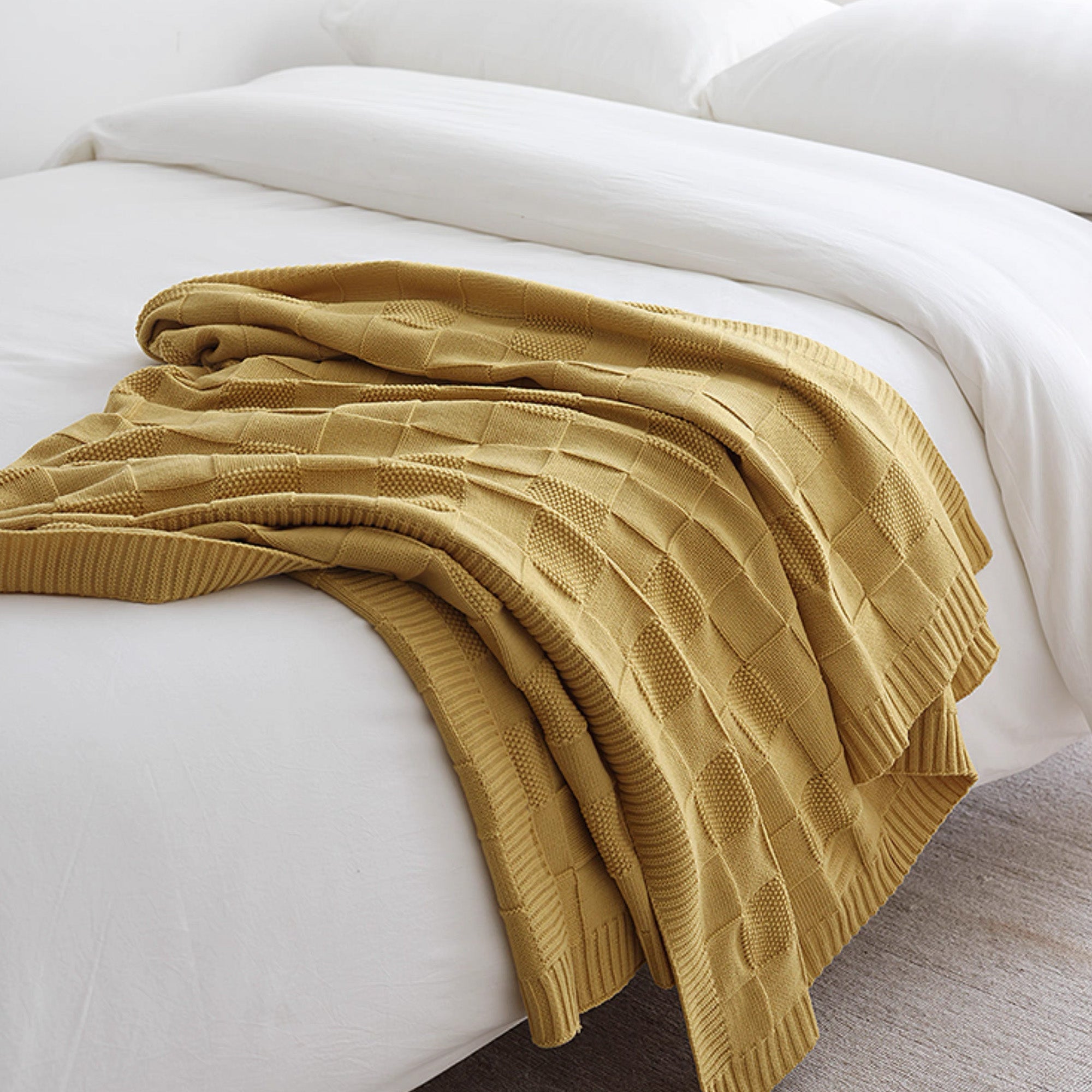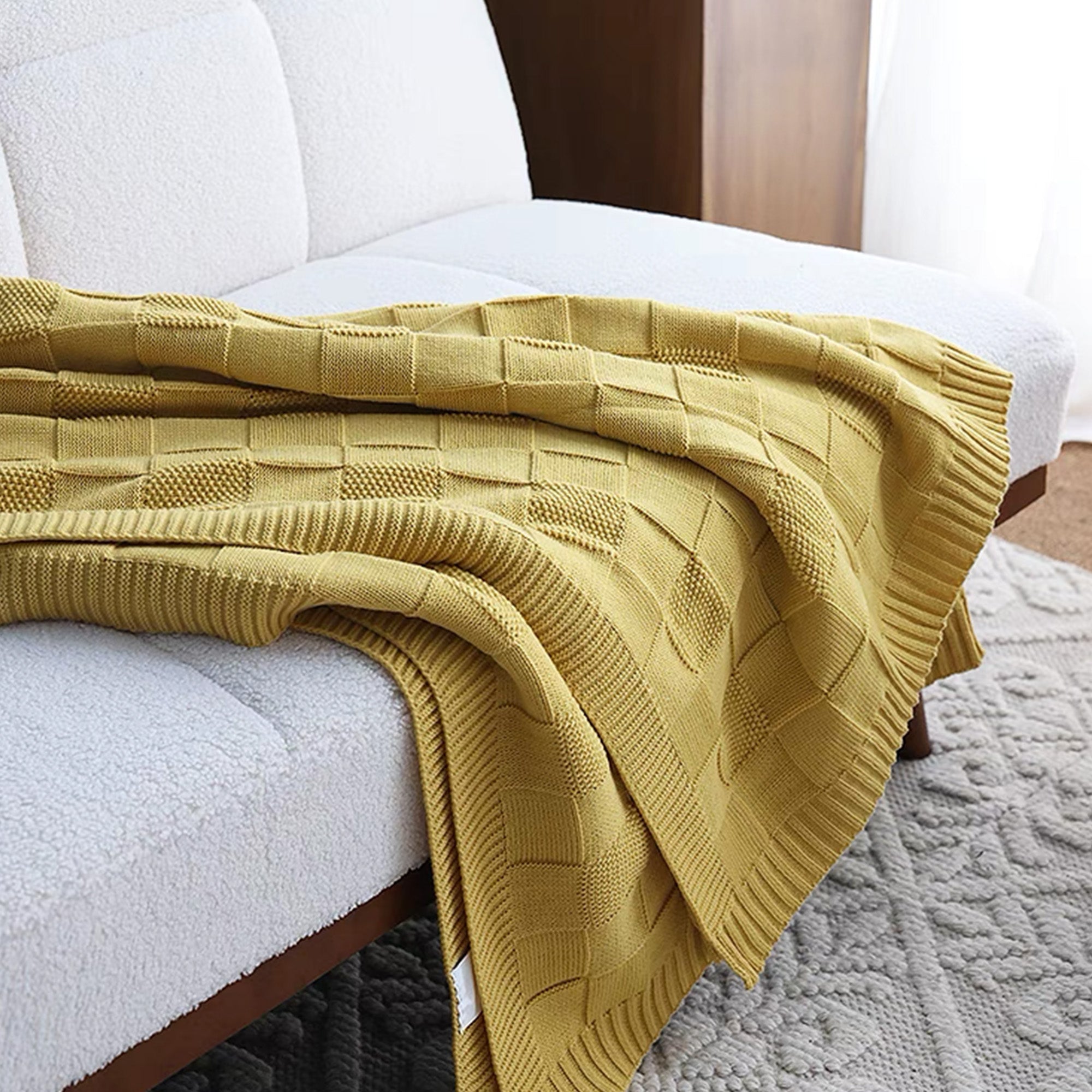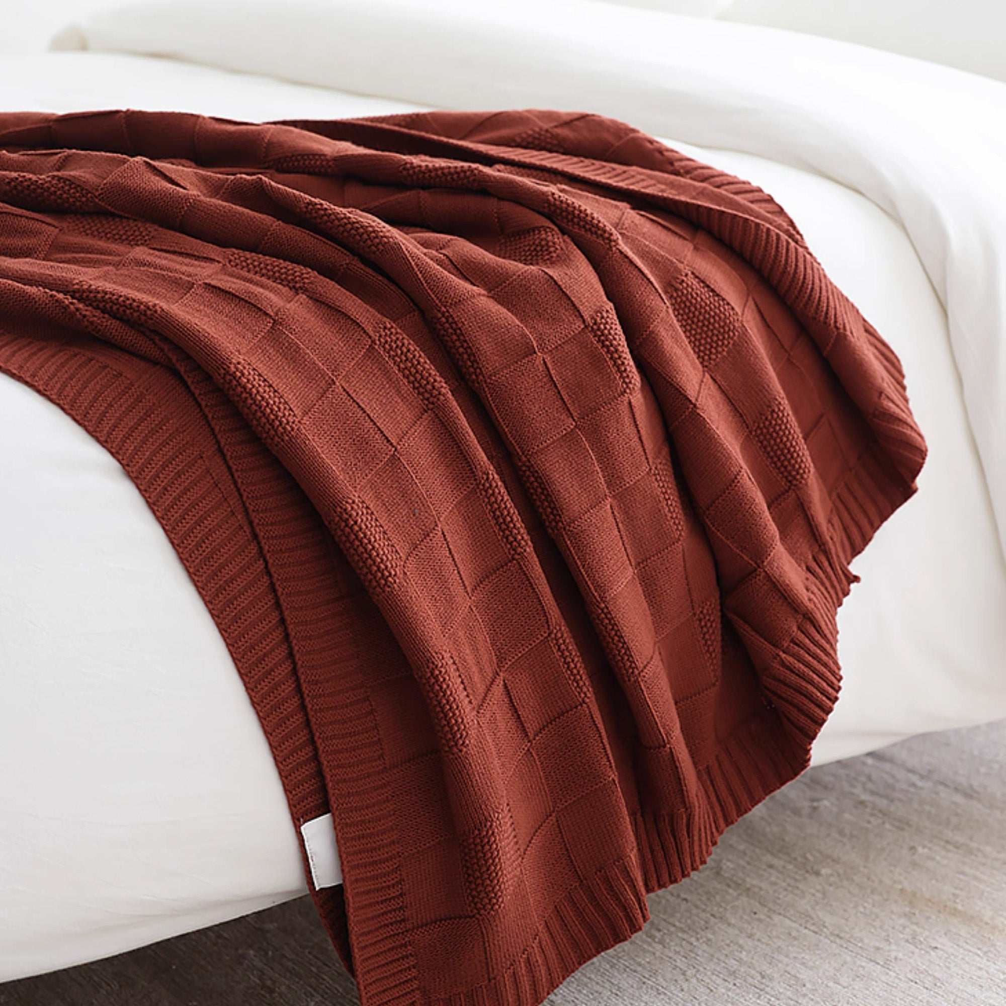 Voeg een vleugje warmte en stijl toe aan je huis met onze Textured Grid Knit Throw Blanket. Deze plaid, ontworpen met een opvallend rasterpatroon en gemaakt van comfortabel, hoogwaardig breiwerk, combineert comfort met een moderne look. De diepe, rijke kleur voegt verfijning toe aan elke kamer en is een perfect accent voor je bank, bed of leesstoel.
